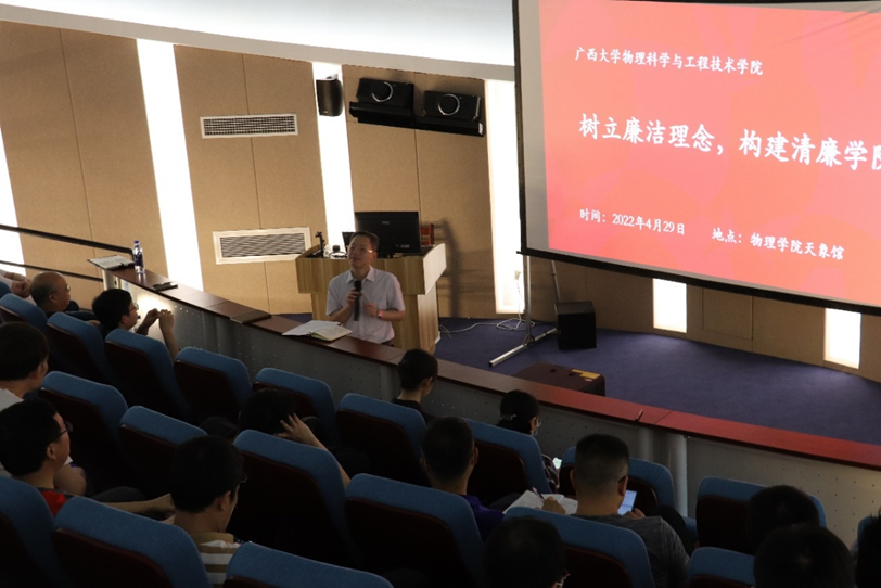 为贯彻落实全面从严治党主体责任和“清廉西大”建设方案,推进建设清廉学院,4月29日,物理学院在天象馆召开“清廉西大”建设动员会,党委书记袁涛作了“树立廉洁理念 构建清廉学院”专题辅导,党委副书记、纪委书记蒋津辉传达了校党委“清廉西大”建设动员会议的精神。