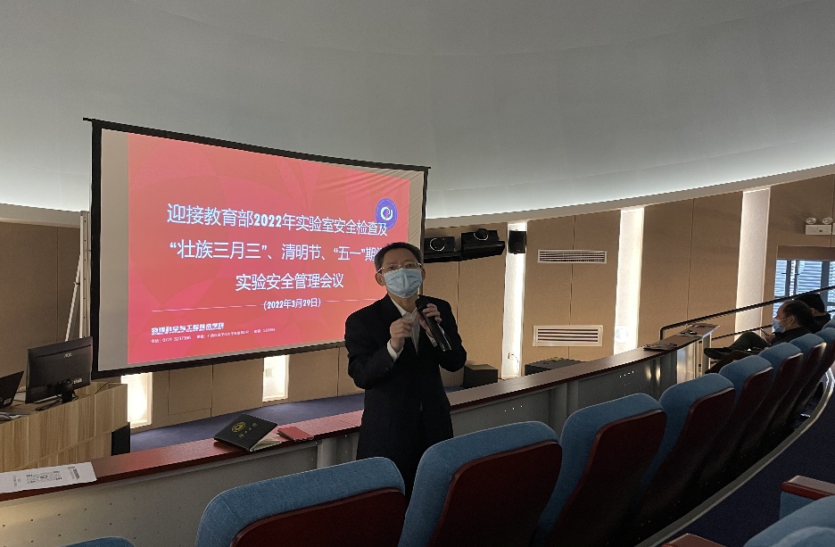 3月29日,我院在学院天象馆召开实验室负责人及安全责任人会议,对迎接教育部实验室安全检查进行动员,对广西三月三、清明节、五一节假日期间实验安全管理工作进行部署。会上,党委书记袁涛强调要对实验室安全隐患进行“全过程、全要素、全覆盖”排查,以教育部有关文件精神为行动指南,以良好的状态迎接教育部实验室安全检查。常务副院长王祥高布置了近期实验室安全重点工作,指出开展此次实验室安全大检查的重要性和必要性。院长助理、实验中心主任陆翔对教育部2022年高等学校实验室安全检查工作的背景、要求和工作安排进行了说明,并对实验室安全自查自纠做了具体安排,要求各实验室在广西三月三、清明节、“五一”等假期期间落实好假期使用备案和值班巡查制度。