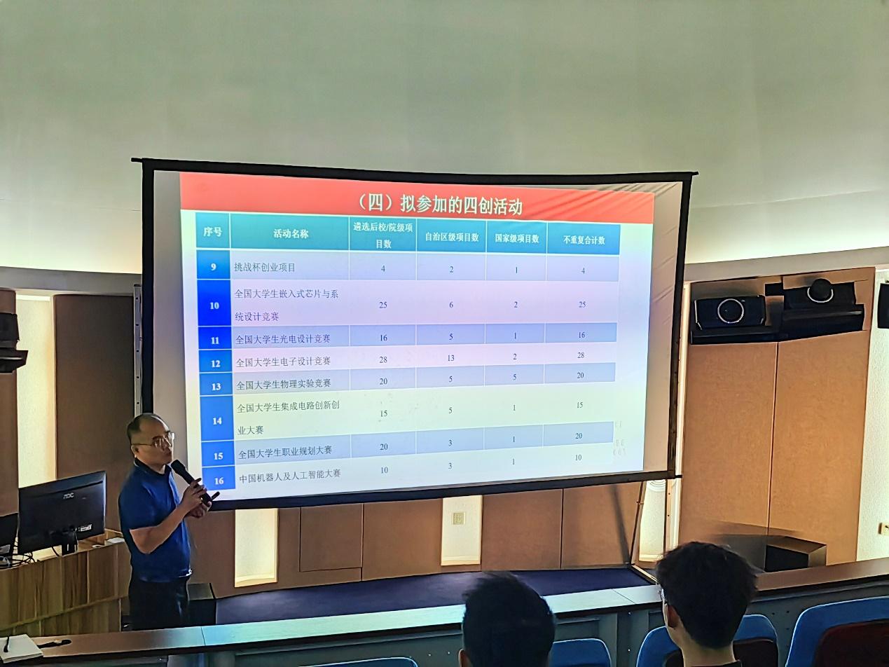 陆翔副院长从近年指导学生创新实践情况、学院四创基地建设、大学生创新创业项目、学科竞赛四个方面进行汇报。他结合个人指导学生经历,细致地给现场专任教师做了汇报,包含近年指导学生成效情况、各类学科竞赛项目介绍等具体内容,动员专任教师利用学科优势,深化科教融合,提炼科研成果,挖掘科研素材,同时结合导师制课程选拔优秀学生,开展科研成果转换和学生创新能力培养工作,为提升教师创新创业教育教学能力指明了方向。