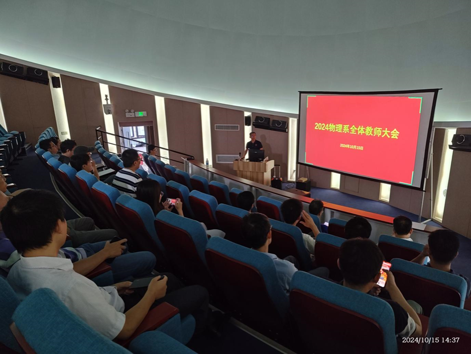2024 年 10 月 15 日下午,我院物理系召开 2024 年全系教师大会。会议主要议题为总结教学与教研成果、剖析现存问题以及规划未来发展方向。会议由系主任梁毅主持,学院教学副院长林达斌出席,物理系副主任刘海镇、黄永波、黎光旭及全系老师参加会议。