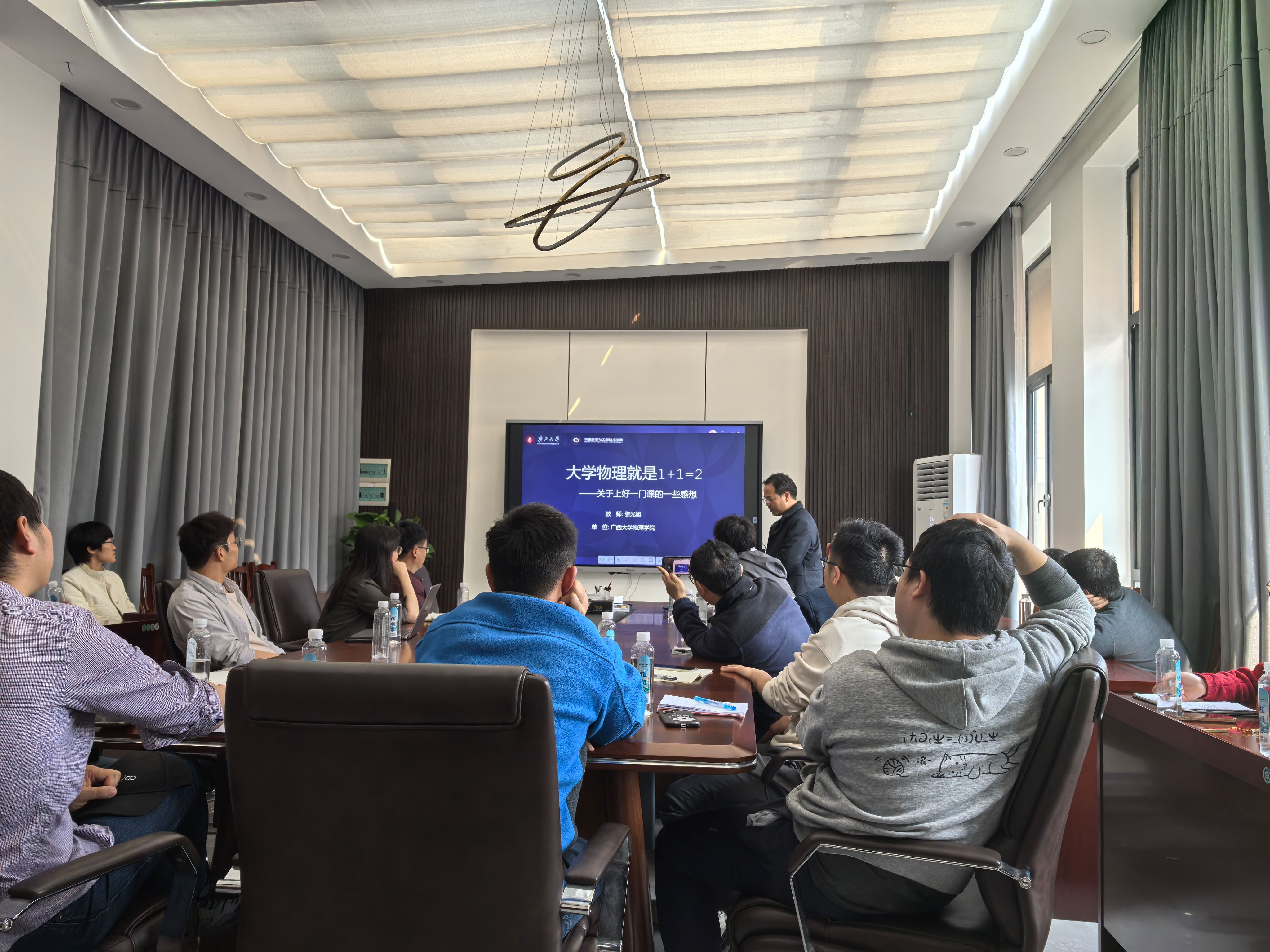 黎光旭、周宇璐老师在会上进行了教学技巧分享。随后,与会教师围绕教学课件设计、数字技术融合、课堂互动与管控、学生成绩管理、试题命制等关键环节展开深入交流。