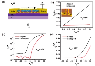 本研究采用化学气相沉积法生长稀土元素钐(Sm)掺杂单层MoS2薄膜。 研究发现,Sm离子在MoS2单层中引入p型掺杂,改变了MoS2的能带结构以及电学性能。 Sm掺杂提高了单层MoS2:Sm基场效应晶体管(FET)的电学性能,其中,阈值电压从-12 V移动到0 V,开关电流比提高了500%,迁移率提高40%。 这项工作对稀土元素掺杂二维TMDCs材料的基础研究及应用具有重要意义。
