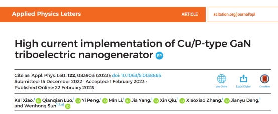 近日,我院孙文红教授领导的光电材料与器件团队在Nature Index著名学术期刊《Applied Physics Letters》上发表了题为"High current implementation of Cu/P-type GaN triboelectric nanogenerator"的研究论文。该论文被编辑选为"Editor's Pick"文章,在APL官网首页加以重点展示(Editor's Picks serve to highlight articles with excellent scientific quality and are representative of the work taking place in a specific field)。