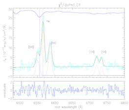Fig. 2: emission line properties around Hα. Solid blue shows corresponding absorption features in top panel.