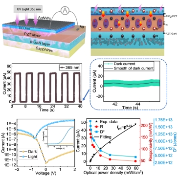 针对自驱动紫外光电探测器性能较低的问题,我院蓝色能源研究团队与西安电子科技大学彭彪林教授合作,以p-GaN作为衬底,在铁电材料PZT中诱导显著的极化场,进而调控TiO2/PZT异质结,增强异质结内建电场。发展的AgNWs/TiO2/PZT/GaN双耦合自驱动紫外光电探测器,在365nm紫外光照射下获得了184.31 mA/W的响应度(R),62%的外量子效率(EQE),1.7×1013 Jones的比探测率(D*),0.16 ms/0.98 ms的快速上升/下降时间,以及8.1×106的高开关比。器件在持续照明下可保持稳定、高效的紫外光探测能力。该研究为发展高性能自驱动光电器件提供了一种有价值的途径。