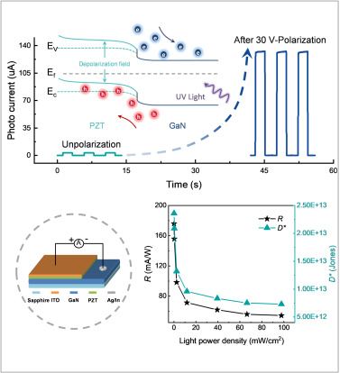 第三代宽带隙半导体GaN是制造紫外光电探测器的优秀候选材料之一,然而由于构建强内建电场以及抑制暗电流的技术难题,高性能GaN基自驱动紫外光电探测器仍然缺乏。我院蓝色能源团队与西安电子科技大学彭彪林教授合作,提出了基于铁电材料调控的高性能自驱动紫外光电探测器。采用溶胶-凝胶法制备了n-GaN/Pb(Zr0.2Ti0.8)O3异质结,构建了一个由铁电性质调制增强的倒装式自驱动紫外光探测器。在30 V极化后,倒装式GaN/PZT/ITO通过增强的PZT退极化场(Edp)和GaN/PZT异质结的内置电场(EGaN/PZT)有效耦合作用,展现了出色的紫外光检测性能。在365 nm光照下,其光电流响应相较于未极化状态增大了40倍,最大光暗比(Ilight/Idark)达到了3.07×107,响应时间高达0.51/0.57 ms,响应率(R)和检测率(D*)分别为176 mA W−1和6.94×1013 jones。该策略为高性能GaN基自驱动紫外光电探测器的设计提供了一种简单可行的方案。