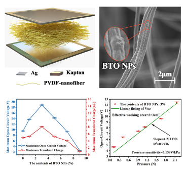提出双重优化策略,通过合成包含钛酸钡(BTO)纳米颗粒和聚偏二氟乙烯(PVDF)的压电复合材料,并使用静电纺丝技术制备了具有高灵敏度响应的柔性压电纳米发电机。在弯曲模式下,优化的柔性PENG产生了19.152 V的最大开路电压、8.058 nC的转移电荷和2.128 V cm−2的单位面积输出电压,压力传感灵敏度为5.159 V kPa−1,电压与压强具备出色的线性关系。此外,该柔性压电纳米发电机在监测手部运动方面表现出良好的传感性能,在智能传感中有重要的应用前景。