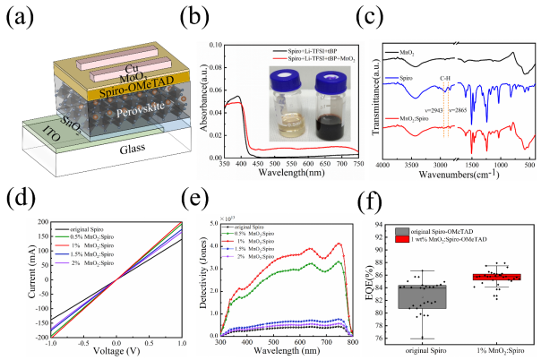 近日,我院光电材料与器件研究团队在钙钛矿基光电探测器的性能研究方面取得进展,研究成果以"High-efficiency perovskite photodetectors using manganese dioxide oxidation Spiro-OMeTAD as hole transport layer"为题被《Ceramics International》杂志接收发表。