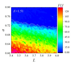 研究小组通过建立试验粒子在黑洞附近的运动方程,观察粒子的运动特征来间接分析黑洞周围的时空性质,试验粒子的运动方程为常微分方程,需要借助数值积分算法求解。在保守系统中,体系能量是重要守恒量,一定程度上决定了整个体系的动力学状态,在积分求解过程中,保持体系能量守恒尤为关键。他们将哈密顿正则方程离散化,构造了适用于此情况的严格保能量算法。此算法具有极高的能量精度,并能长时间稳定。利用此算法,模拟试验粒子在科尔-纽曼黑洞周围的运动轨迹,并分析了试验粒子的动力学特征,发现当黑洞自旋a较小(时空拖曳现象不明显)、试验粒子角动量L较小时,试验粒子容易产生强混沌运动。