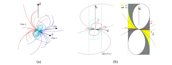 近日,以英国上市公司365物理学院为第一单位,来自国家天文台、北京大学、贵州师范大学和中国科学院大学的研究人员,利用中国天眼FAST对全相位辐射的射电脉冲星B0950+08进行偏振观测,绘制出了脉冲星B0950+08的三维磁层结构和子午面辐射几何(磁轴和自转轴共面),如图1所示