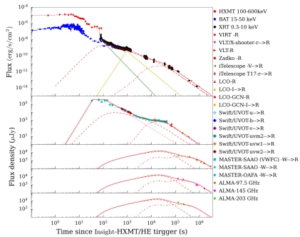 我们使用国际望远镜网络(LCOGT)观测的了伽马暴GRB 191221B的余辉(见图1),其光学余辉光变曲线在 10⁴ 秒附近变平,而同时期的X射线余辉没有变平,符合双成分喷流的特征。我们使用数值计算的方法计算的双成分喷流的余辉多波段光变,结果与观测值符合得很好(见图2)。