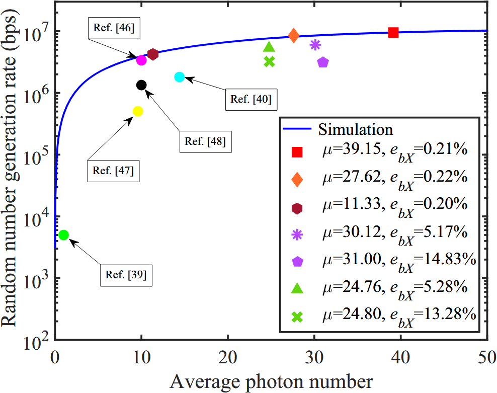 研究团队基于图1所示的集成化平台开展性能验证,通过调控不可信光源的平均光子数与偏振态构建两类测试场景:第一类维持最优误码率仅改变平均光子数,第二类采用非优参数组合。经发射1010光脉冲进行测量并通过后处理分析,结果如图2所示。系统在平均光子数为39.15时达到9.49 Mbps最高速率,而非理想参数场景下安全速率显著降低。实验结果充分验证了系统的源无关特性——非优参数下的实际性能始终受限于理论最优值,实现了源无关量子随机数生成的核心优势验证。