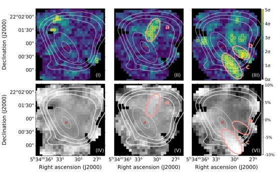 其中,位于研究区域北部和西南部的区域a和区域bPD变化具有超过4σ3σ的显著性水平。位于西南部的区域cPD则显著降低,其显著性水平超过5σ。然而,偏振角(PA)未表现出明显的变化。