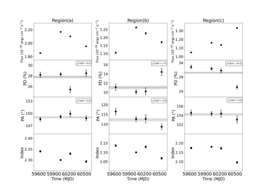 成像X射线偏振探测器IXPE自发射以来对Crab蟹状星云进行空间分辨的X射线偏振探测我们利用IXPE卫星的观测数据,研究了蟹状星云在两年内空间分辨的偏振变化,并提供了其磁场结构及演化的关键见解。结果显示,在2--8 keV能区的三个感兴趣区域内,偏振度(PD)存在显著的时间变化。