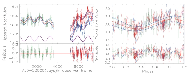 Fig.1: Left panel shows the light curves from CSS and ZTF, and the best descriptions by sine component plus polynomial component. Right panel shows the corresponding phase-folded light curves.