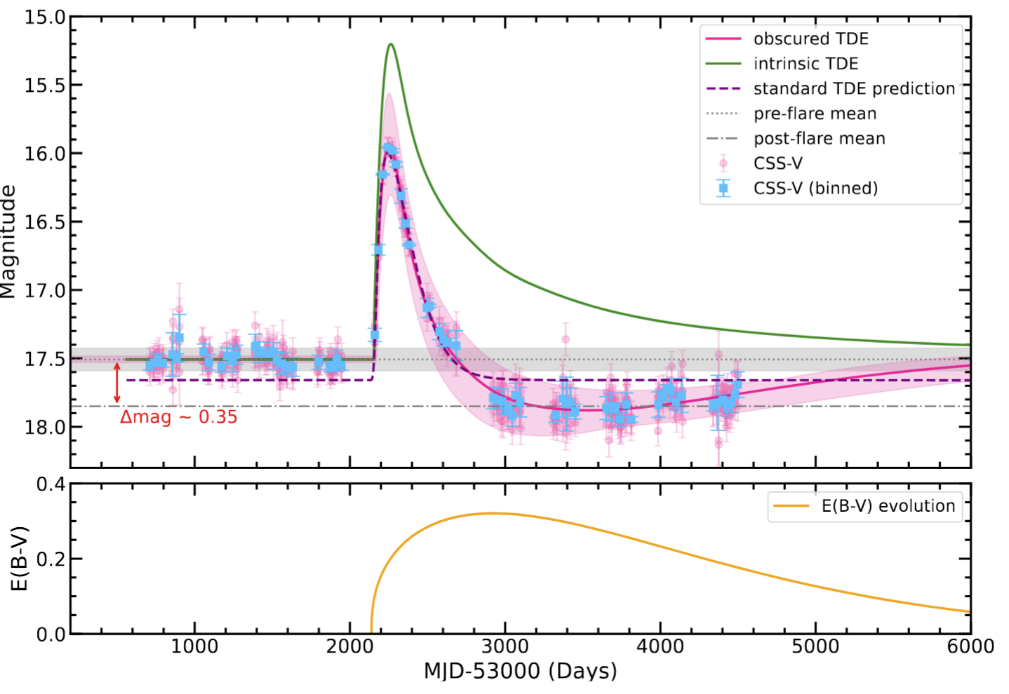 图一: 上图:粉色点表示单次曝光的 CSS V 波段原始数据。蓝色点为bin后的数据粉色实线为遮蔽 TDE 模型的最佳拟合结果,粉色阴影区域表示由模型参数不确定性确定的置信区间。作为对比,绿色实线表示去除遮蔽成分后恢复的本征 TDE 光变曲线,紫色虚线表示假设无遮蔽时常规理论 TDE 模型的预测。黑色虚线和灰色带分别表示爆发前星等的均值和标准差,灰色点划线表示爆发后星等的均值,比爆发前暗约 0.35 星等(红色箭头所示)。下图:遮蔽 TDE 模型最佳拟合参数所确定 E(B–V) 的时间演化。
