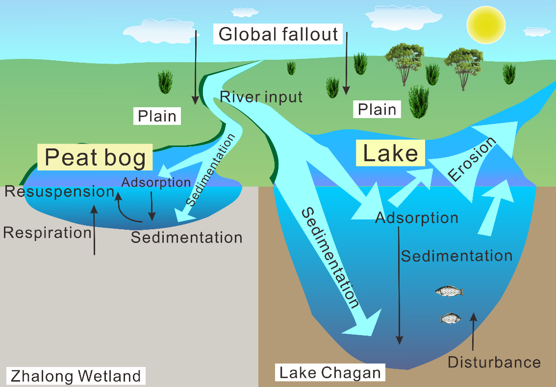 图2. 扎龙湿地与查干湖核素沉积示意图;箭头示意放射性核素运移方向。