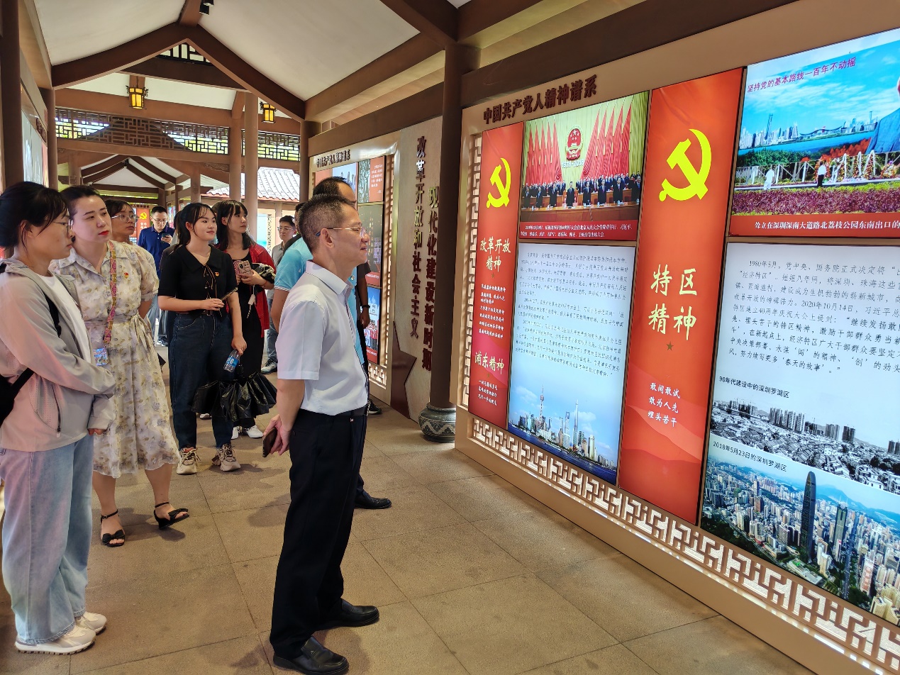 Under the guidance of the commentator, the party members visited the theme park of the CPC's spiritual pedigree. The theme park vividly displayed the glorious history and great achievements of the CPC's centennial struggle in a multi-dimensional, multi-level, and multi integrated way, which gave everyone a deeper understanding of the series of great spirits formed during the period of the new democratic revolution, the period of socialist revolution and construction, the new period of reform and opening up, the new period of socialist modernization, and the new era of socialism with Chinese characteristics.